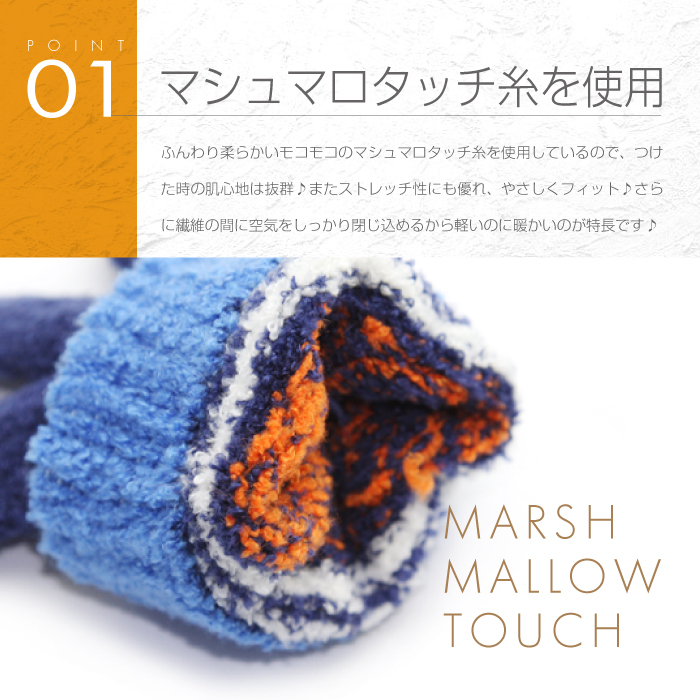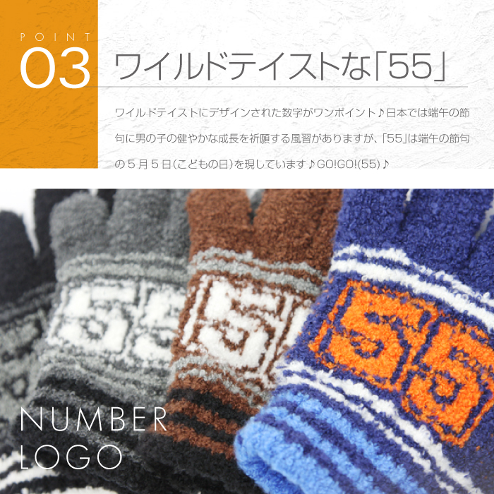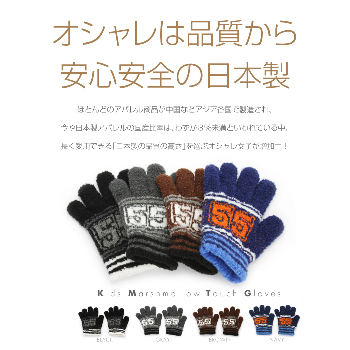 圧倒的に軽くて柔らかい「マシュマロタッチ糸」を使用した肌ざわり抜群のふわふわキッズ手袋♪ストレッチ性に優れたリブ編みカフスが手首にフィットし、冷気が侵入しにくい「保温設計」♪ワンポイントの「55」は男の子の健やかな成長を祈願する端午の節句の5月5日(こどもの日)を表現♪品質の日本製。
