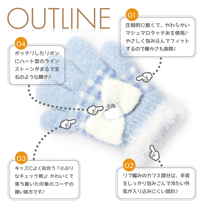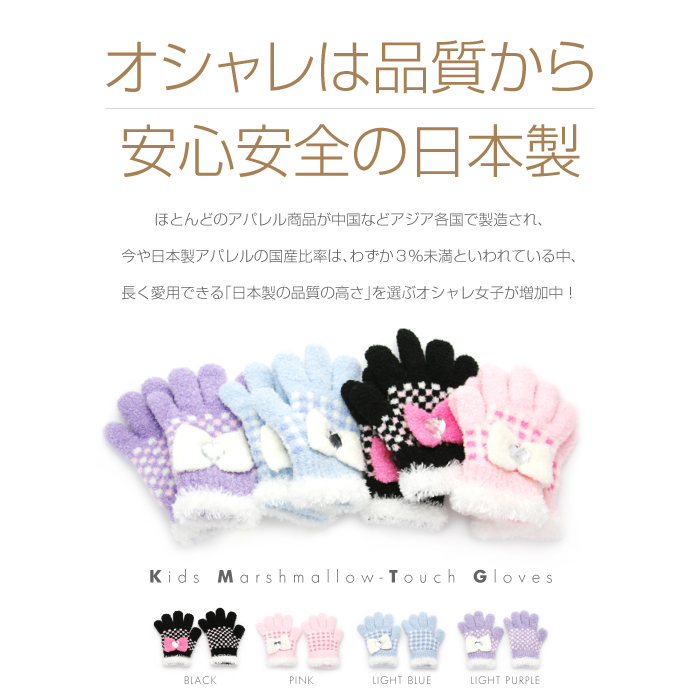 圧倒的に軽くて柔らかい「マシュマロタッチ糸」を使用したふわふわキッズ手袋♪カワイイだけでなく使い心地も抜群♪手首から冷気が侵入しにくい「保温設計」♪清潔感があってキュートな大人気の「チェック柄」♪甲側にはリボン留めにデザインされたハート型のラインストーンが光に反射すると宝石のように♪カラーは全4色♪品質の日本製。