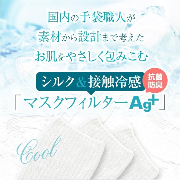 国内の手袋職人が素材から設計まで考えたお肌をやさしく包み込む「肌面シルク&接触冷感の純銀糸マスクフィルターAg+」♪立体的に編み上げた無縫製なので、お肌にやさしくフィット♪シルクの肌触りでありながら、接触冷感素材を編み込んでいるので、着けた瞬間ひんやり♪内部に純銀糸とナイロンを編み込み、銀イオンの優れた抗菌、防臭効果が得られます♪また洗濯しても、その機能が無くなることはなく、傷みにくく、シワにもなりにくく、繰り返し洗って使えます♪※本品は純銀糸を使用していますが、金属アレルギーの方で、ご不安に思われる方はご使用、ご購入をご遠慮ください。