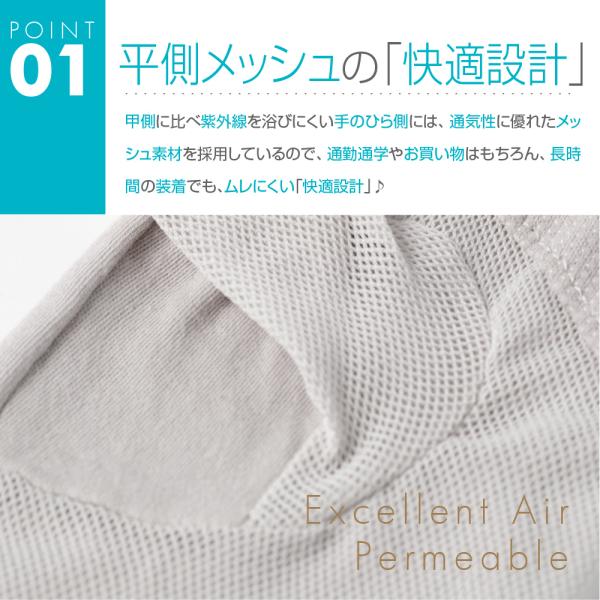 紫外線を浴びにくい手のひら側には、通気性に優れたメッシュ素材を採用♪通勤通学やお買い物、長時間の装着でも、ムレにくい「快適設計」♪また、手のひら側には、「すべり止め」が付いているので、自転車や車の運転時にも大活躍♪甲側になめらかな肌ざわりの「コットン100%スムース生地」を採用♪吸水性、通気性が高く、春夏秋シーズンにも最適な素材です♪派手過ぎない素材感を活かしたデザインなので、春夏シンプルコーデとも相性の良いアイテムです♪