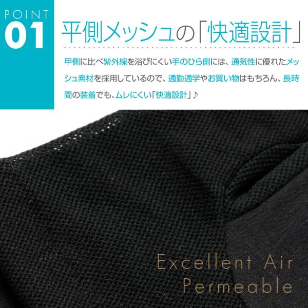 紫外線を浴びにくい手のひら側には、通気性に優れたメッシュ素材を採用♪通勤通学やお買い物、長時間の装着でも、ムレにくい「快適設計」♪また、手のひら側には、「すべり止め」が付いているので、自転車や車の運転時にも大活躍♪なめらかな肌ざわりの「コットン100%スムース生地」を甲側に採用♪吸水性、通気性が高く、春夏秋シーズンにも最適な素材です♪派手過ぎない素材感を活かしたデザインなので、春夏シンプルコーデとも相性の良いアイテムです♪