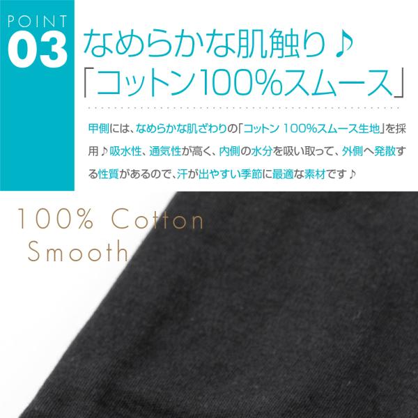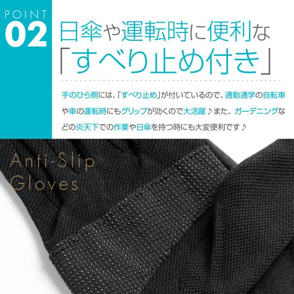 紫外線を浴びにくい手のひら側には、通気性に優れたメッシュ素材を採用♪通勤通学やお買い物、長時間の装着でも、ムレにくい「快適設計」♪また、手のひら側には、「すべり止め」が付いているので、自転車や車の運転時にも大活躍♪なめらかな肌ざわりの「コットン100%スムース生地」を甲側に採用♪吸水性、通気性が高く、春夏秋シーズンにも最適な素材です♪派手過ぎない素材感を活かしたデザインなので、春夏シンプルコーデとも相性の良いアイテムです♪