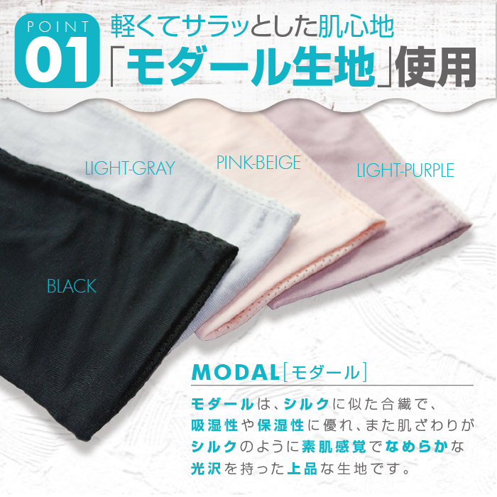 シルクに似た合繊で、吸湿性や保湿性に優れ、また肌ざわりがシルクのように素肌感覚でなめらかな光沢を持った上品な生地です。カラーはブラック、ライトグレー、ピンクベージュ、ライトパープルの4色からお選びいただけます。