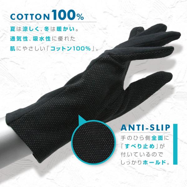すべり止めが指先までカバーしているので、車や自転車の運転や、お買い物などでお出かけする際にも、日傘やお荷物なども持ちやすく大変便利です♪また、昨今のコロナ禍に伴い、つり革やドアノブ、エレベーターのボタンなどに直接触れたくないという方には、感染対策の一つとしてご活用ください。素材は、通気性、吸水性に優れ、肌にやさしい綿100%。夏は涼しく、冬暖かい素材なので、通年でお使いいただけます。