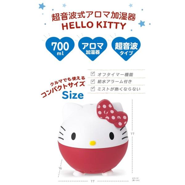 ●ひとこと: ・スイッチオンでハローキティの頭からミストを噴射しお部屋に潤いを与えてくれます。 ・オフタイマー機能や給水アラーム・抗菌カートリッジが付属します。 ・超音波式なのでミストが熱くならずお子様がいるご家庭でも安心です。 ・お好みのアロマで癒しの空間を演出します。本体背面にアロマトレイが付属します。