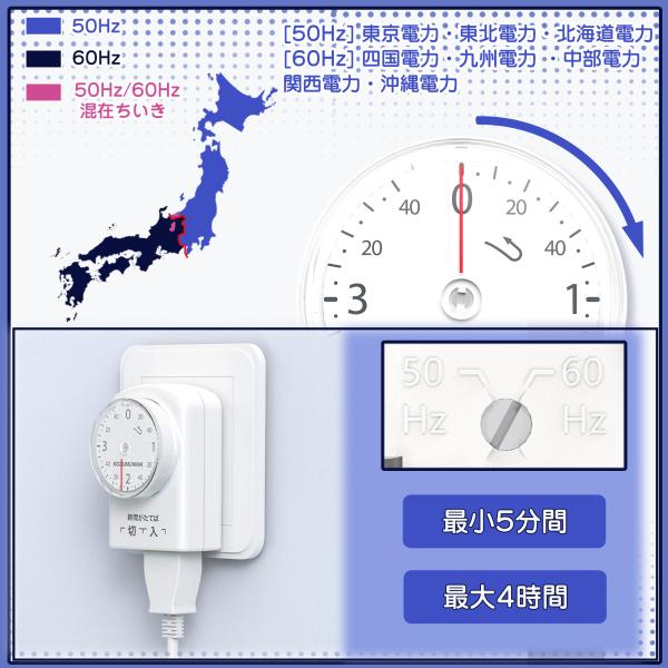 電池不要でコンセントに差し込むだけのシンプル操作。最長3時間40分まで5分単位で設定可能。