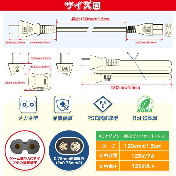 AC電源ケーブル メガネ型 延長電源ケーブル メス 2P ピン 2ピンソケット(メス) 2ピンプラグ(オス) 1.2m コネクター PSE認定品 ACコンセント トラッキング対策