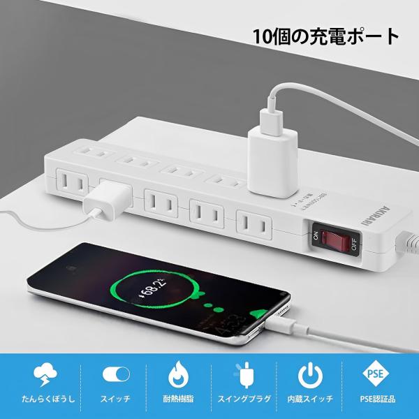 電源タップ USB-C USB-A コンセント 4口 AC2口 USB2口 スイングプラグ コンパクト 軽量 旅行 出張 テレワーク ベッドサイド PSE認証 保証付き 隙間 たこ足