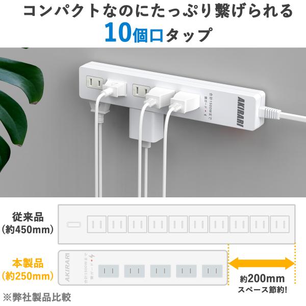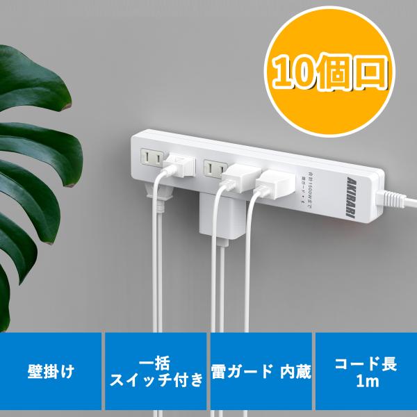 【あす楽対応 】電源タップ コンセント10個口 1m 18ヵ月保証 雷ガード ブレカーリセット 集中スイッチ コンセントタップ ホワイト アダプター対応 ポイント利用