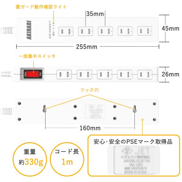 コード1m・6ヵ月保証(レビューで18ヶ月保証)・AC10電源タップ