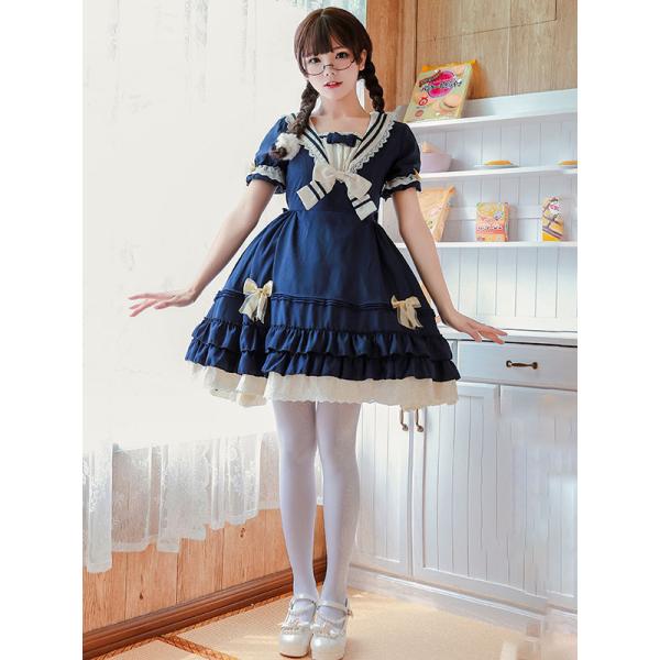 スウィートロリータOPドレスライン帆の帆フリルブルーロリータワンピースドレス