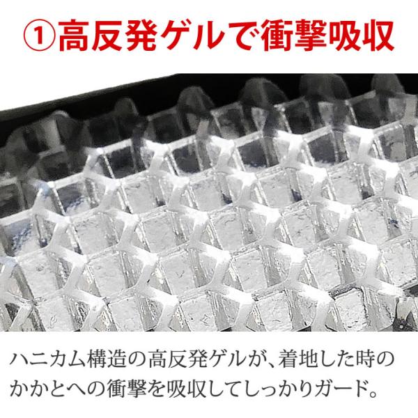 かかと部分はハニカム構造の高反発ゲル素材で、着地の衝撃を吸収してガード、足裏のアーチ部分は形状を保持・強化するために硬めの素材、つま先部分は足にフィットする適度な弾力で、滑り止め効果もあるので靴の中でズレにくく快適な履き心地です。