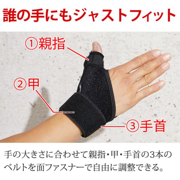 装着は親指を穴に通して、親指・甲・手首の3カ所に付いているベルトを面ファスナーで固定するだけ。
