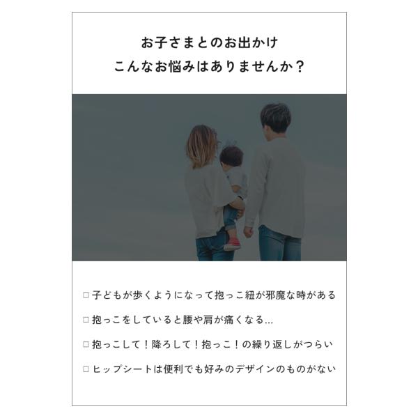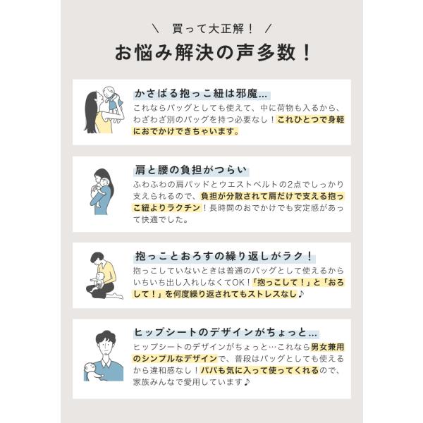 ※抱っこ紐やヒップシートとしてお使い頂けますが、長時間の使用は肩へのご負担も懸念されます為、短時間を繰り返す形でのご利用を推奨しております。