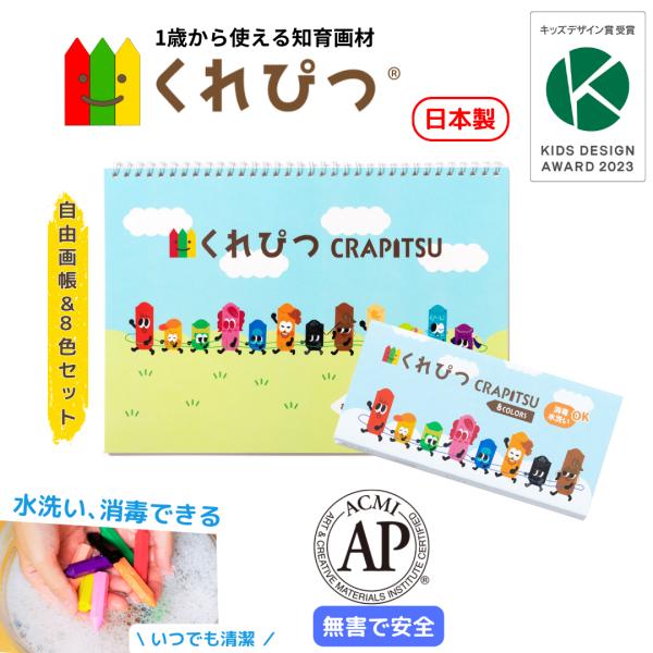 くれぴつ スリーブ箱8色+自由画帳 セット 日本製 安全 クレヨン 画材 色鉛筆 はじめてお絵描き 折れない 汚れない 1歳 2歳 赤ちゃん プレゼント ギフト