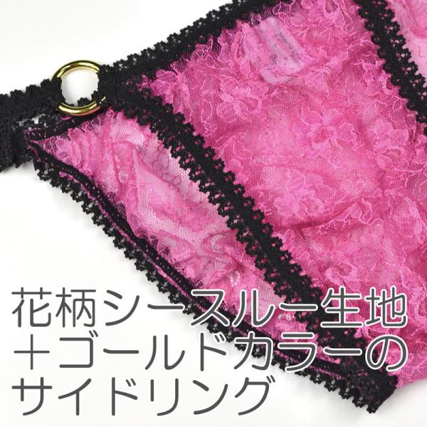透け感のある花柄のシースルーレースにゴールドカラーの装飾リングを合わせたメンズビキニショーツです。