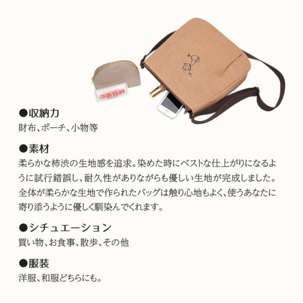 2:汚れにくくさらりと清潔な手触りの綿布生地と、美しい柿渋染めの色合いが魅力。あらゆるシーンに対応可能な、カジュアルで上品な可愛いバッグです。