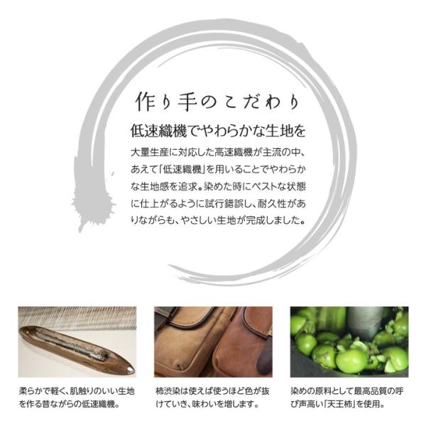 柿渋染めは帆布生地を強く保護し、抗菌、防臭効果に優れ、使い込むほどに味わい深く経年変化する色合いも楽しめます。