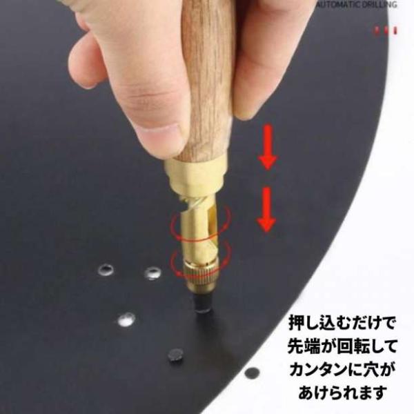 ハンマー不要で、押し込むだけで先端が回転し、穴あけが可能。