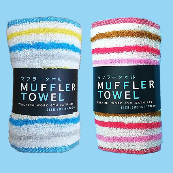 【送料無料】八木春 マフラータオル 幅15cm×長さ120cm フェイスタオル ハンカチタオル リバーシブルストライプ アクア・チェリー (管理コード18-40mayoC)