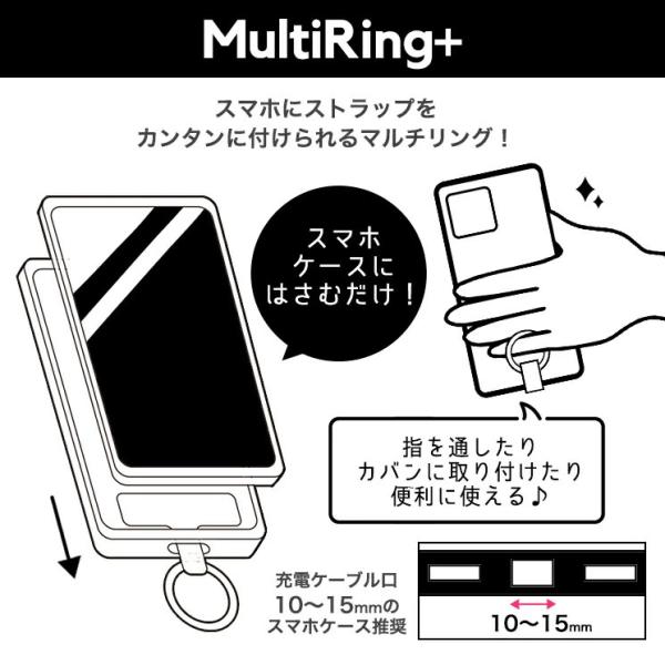 スマホケースの中に挟むだけでマルチに使えるスマホアクセサリです。付属のネックストラップと組み合わせることで、ネックストラップとして使用可能です。ネックストラップは全長47.5cm。※本製品は、充電ケーブル口の幅が10〜15mmのスマホケースと組み合わせてのご使用を推奨しております。推奨寸法以外のケースでのご使用は、充電口から本品が抜けやすくなる場合がございますのでご注意ください。
