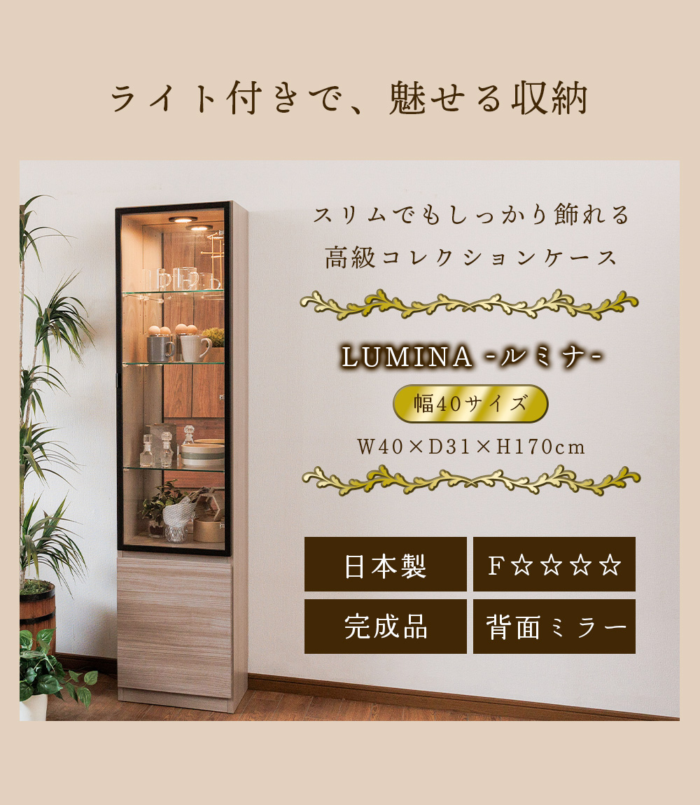 日本製 高級 国産 コレクションケース 幅40 LEDライト付き バーキャビネット ガラスキャビネット お酒 ウイスキー ボトル グラス 収納 ディスプレイ ルミナ 爆買