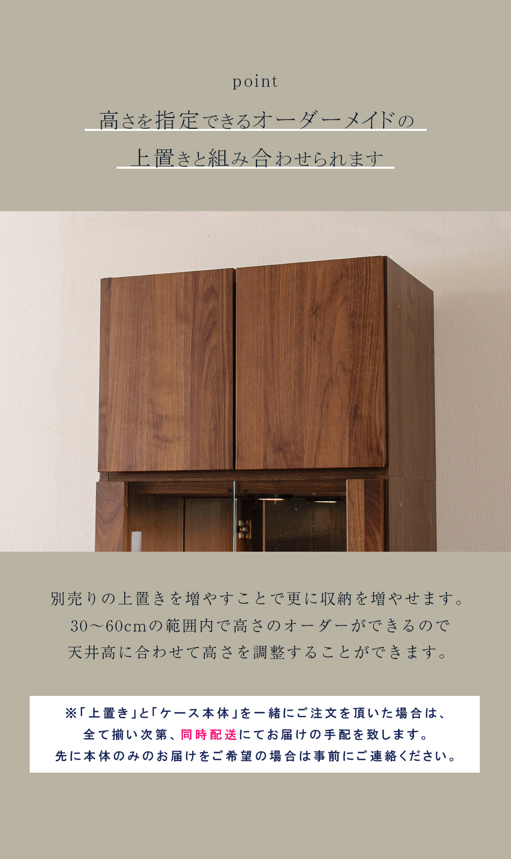 ・上置き、棚ガラスなどの受注生産品との同時購入の場合は、全て揃い次第お届けの手配を致します。