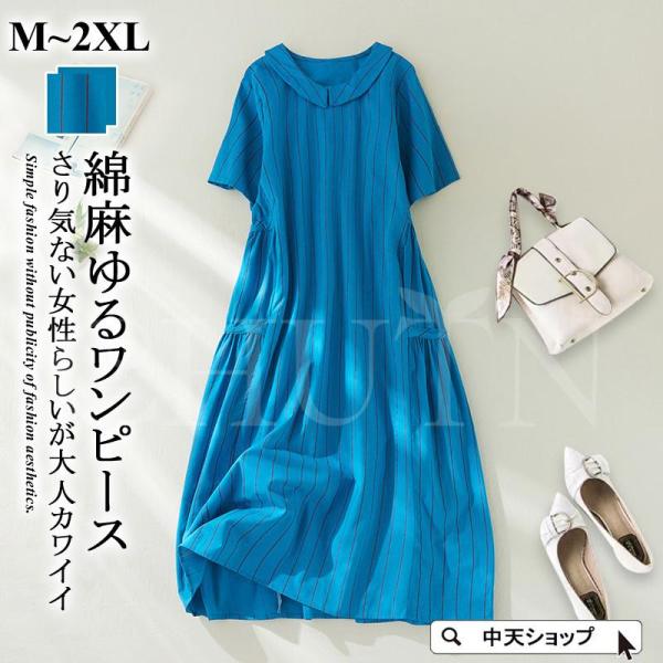 ワンピース レディース 40代50代 半袖ワンピース 綿麻風 夏ワンピース ストライプ カジュアル ゆるワンピース ロングワンピース お洒落 ゆったり