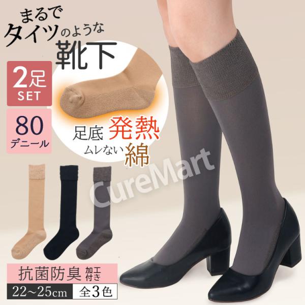 ストッキングソックス 足底ぽかぽか 薄手 ハイソックス 吸湿発熱◆2足セット 22-25cm 3042PW 口ゴムゆったり メール便送料無料 まるでストッキング 暖かい 靴下