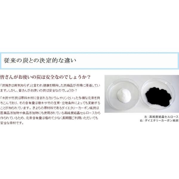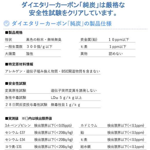 原材料:粉末炭(国内製造)、マルトデキストリン、グァーガム酵素分解物(食物繊維)/微結晶セルロース、微粒二酸化ケイ素、ステアリン酸Ca、シェラック