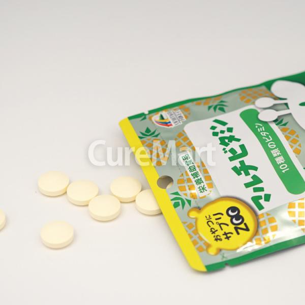 原材料:ぶどう糖(国内製造)、麦芽糖、でん粉、マルトデキストリン/ビタミンC、結晶セルロース、クエン酸、ステアリン酸カルシウム、二酸化ケイ素、ナイアシン、甘味料(アスパルテーム・L-フェニルアラニン化合物)、パントテン酸カルシウム、香料、ビタミンB6、ビタミンB2、ビタミンB1、ビタミンA、葉酸、ビタミンD、ビタミンB12