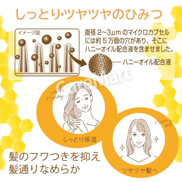 マイクロカプセルに含ませたハニーオイル配合液が、髪にしっとりとしたうるおいとツヤを与えます。