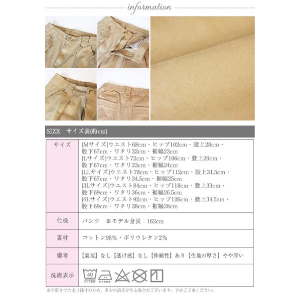 ■サイズ:M(ウエスト:68cm、ヒップ:102cm、股上:28cm、股下:67cm、ワタリ:32cm、裾幅:23cm)・L(ウエスト:72cm、ヒップ:106cm、股上:29cm、股下:67cm、ワタリ:33cm、裾幅:24cm)・LL(ウエスト:78cm、ヒップ:112cm、股上:31.5cm、股下:67cm、ワタリ:34.5cm、裾幅:25cm)・3L(ウエスト:84cm、ヒップ:118cm、股上:33cm、股下:69cm、ワタリ:36cm、裾幅:26.5cm)・4L(ウエスト:92cm、ヒップ:126cm、股上:34.5cm、股下:69cm、ワタリ:38cm、裾幅:28cm)