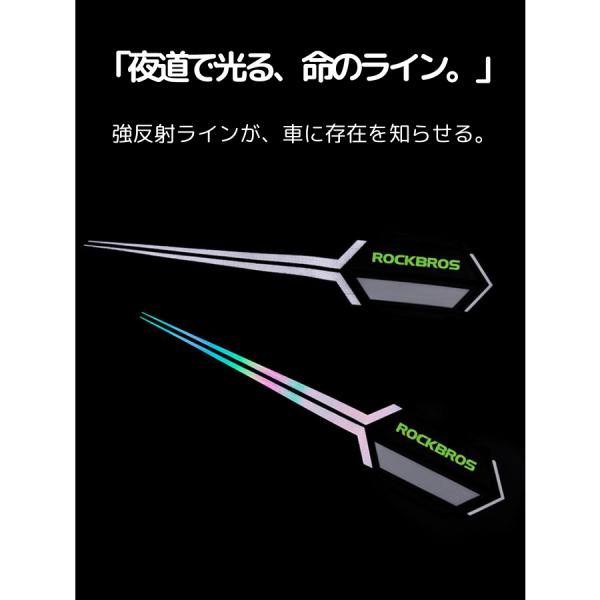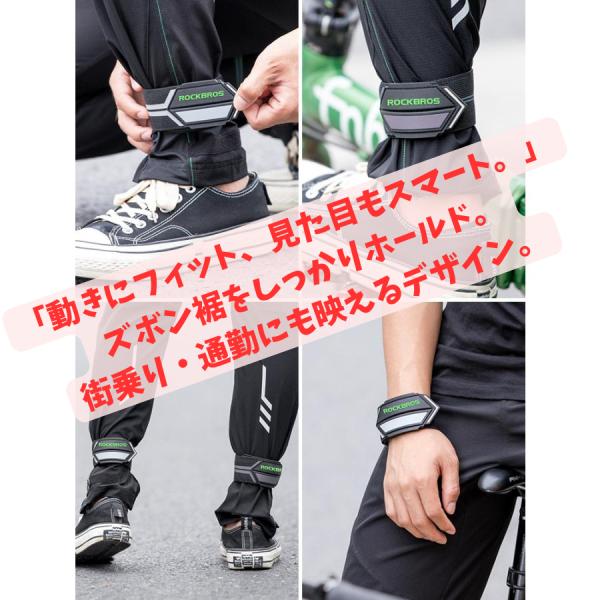 夜間の視認性を劇的に高める高輝度反射裾止めバンド。 【用途】自転車、ロードバイク、クロスバイク、ランニング、散歩、犬の散歩、通勤、通学、子供の塾帰り、アウトドア、キャンプ、防災。 【解決する悩み】ズボンの裾汚れ防止、チェーン巻き込み事故防止、夜間の交通事故防止。 【特徴】 ・300m先からでも視認可能(※環境による)な高輝度反射材。 ・強力面ファスナー(マジックテープ)で簡単に装着。 ・伸縮素材で足首、手首、腕、バッグなど幅広くフィット。 ・ROCKBROS正規品。軽量・コンパクトで持ち運びも楽々。