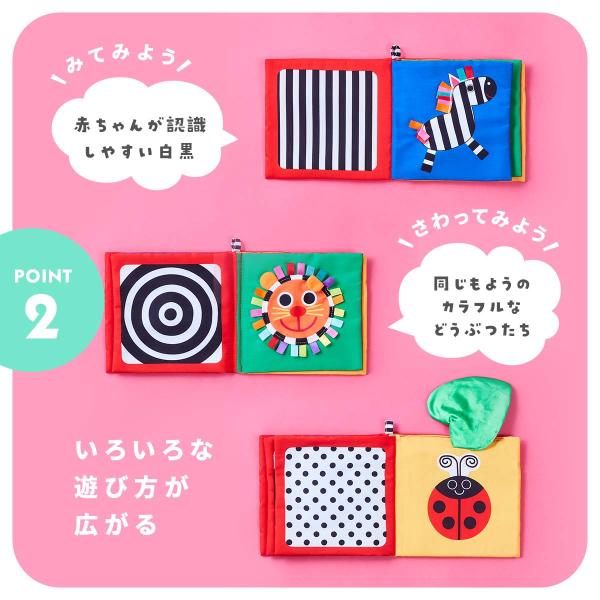赤ちゃんが認識しやすい白黒のぐるぐる、ドット、しましまのページの隣には、楽しい仕掛けがたくさんあるカラフルなページが。