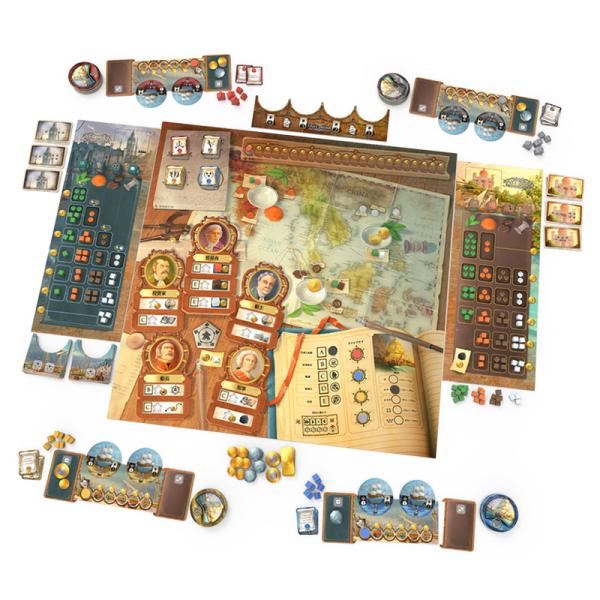 『東インド会社』では、あなたは4つの海運会社のうち1社の経営を請け負います。極東で商品を仕入れ、それらを船でヨーロッパへ運び、売却して利益を獲得します。そうして得た金貨で港を拡張し、最先端の船を導入して、事業を拡大しましょう。さらに交易だけでなく、株取引で競争相手の成長から利益を得ることもできます。