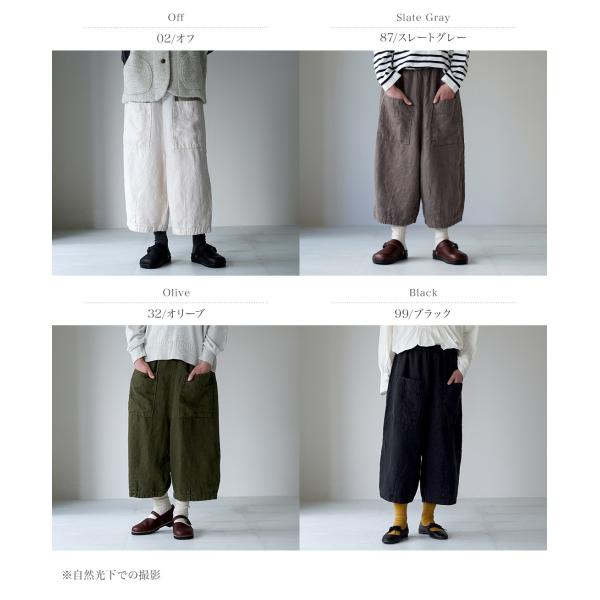 tumugu定番のオリジナル素材「ソリトリネン」を使用した、8分丈パンツ。くたっと柔らかな風合いと、締めつけ感のない穿き心地が魅力の一枚です。