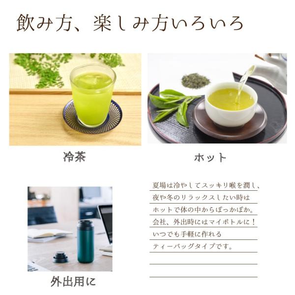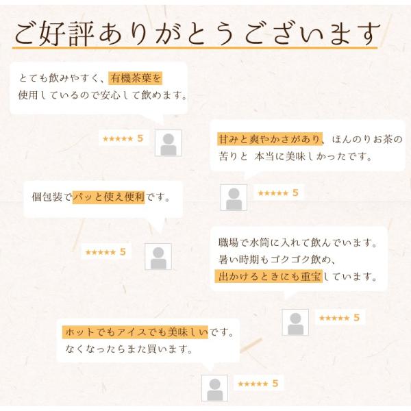 九州鹿児島県産の無農薬、化学肥料不使用の茶葉を使用し、美味しく体に優しいお茶にしました。体を気遣うデリケートな時期の方やお子さんにも、より安心してお召し上がり頂くためにオーガニックにこだわりました。抹茶もオーガニックです。ティーバッグは国内産の不織布で無漂白です。