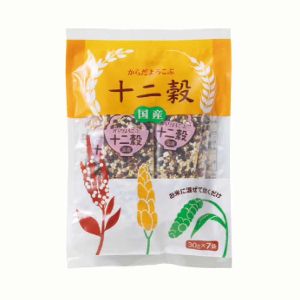 すべて国産の原料を使用し、素材のやさしさを大切に仕上げた雑穀 からだよろこぶ十二穀 です。