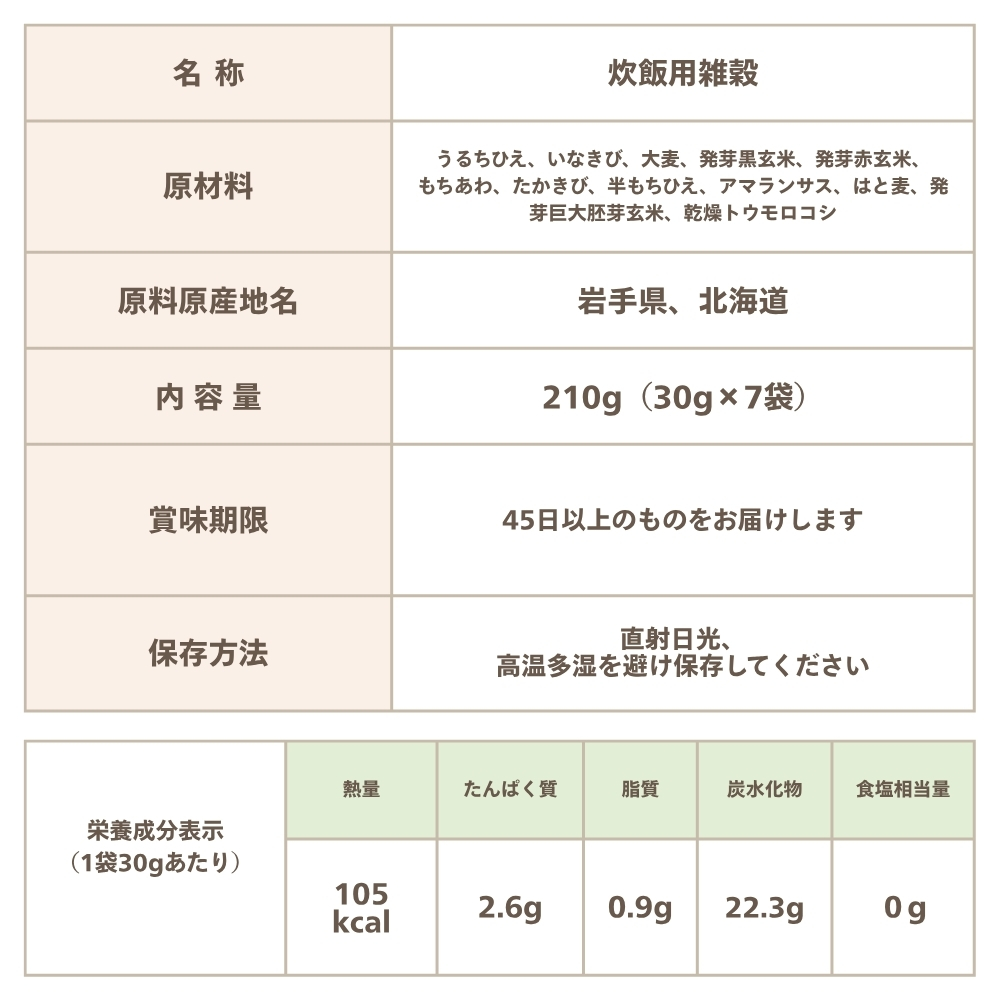 ●原材料名:うるちひえ、いなきび、大麦、発芽黒玄米、発芽赤玄米、もちあわ、たかきび、半もちひえ、アマランサス、はと麦、発芽巨大胚芽玄米、乾燥トウモロコシ(挽割)