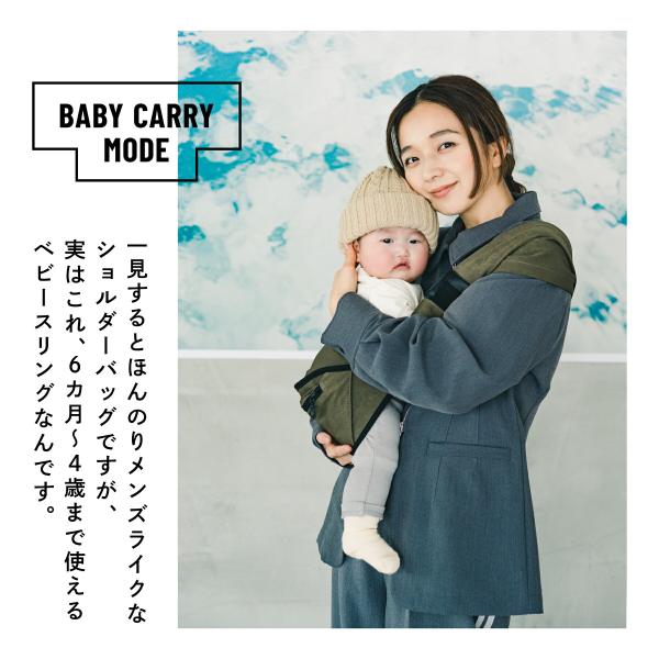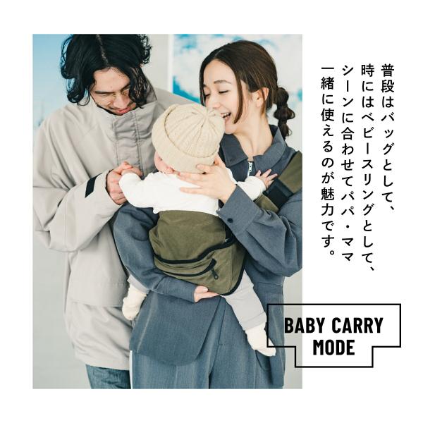 肩を包み込むように広がるショルダーカバーが、肩への負担を軽減し、抱っこ中の快適さを向上。バッグとして使う時はカバーを折りたたみ、ベビースリングとして使う時はカバーを広げるだけで、見た目も機能も満足できます。ポケットは必要最低限の収納力を持ちつつ、シンプルでスマートなデザインを実現しています。持ち運びも簡単で、かさばらず使い勝手が良いのが特徴です。