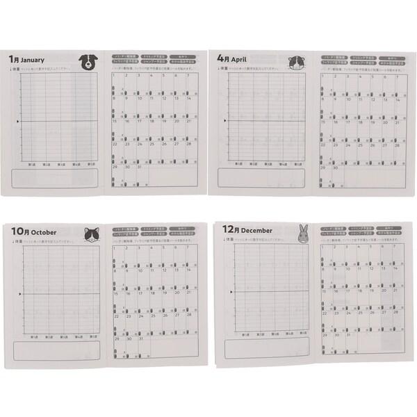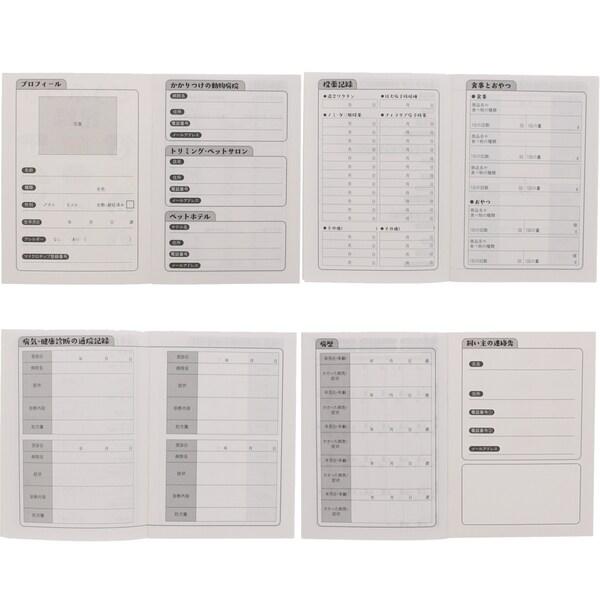 仕様:かかりつけ動物病院情報1ページ、ワクチン情報1ページ、食事量情報1ページ、通院記録1ページ、日々の記録(1月〜12月)24ページ、病歴1ページ