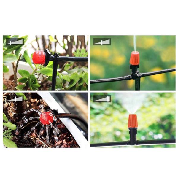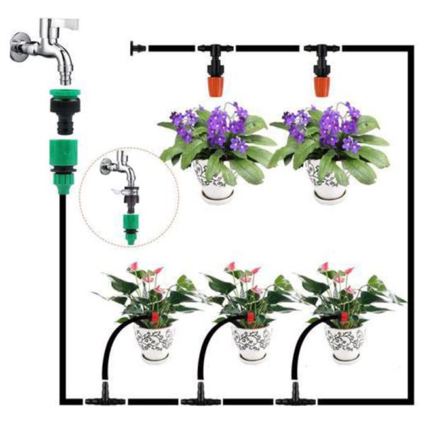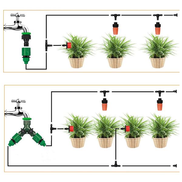 【水源に合わせ、自由自在な灌漑!】蛇口コネクタと2ウェイホーススプリッターが付属しており、さまざまなニーズに対応可能です。水源が植物側に単一方向に配置されている場合は、蛇口コネクタを使用して単一の水路を構築し、水源が植物の中間に位置して両側に広がっている場合は、2ウェイホーススプリッターを使用して、双方向水路を構築できます。