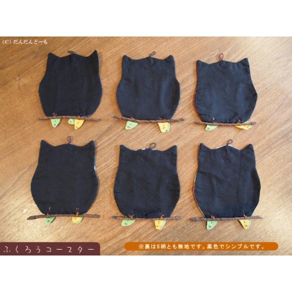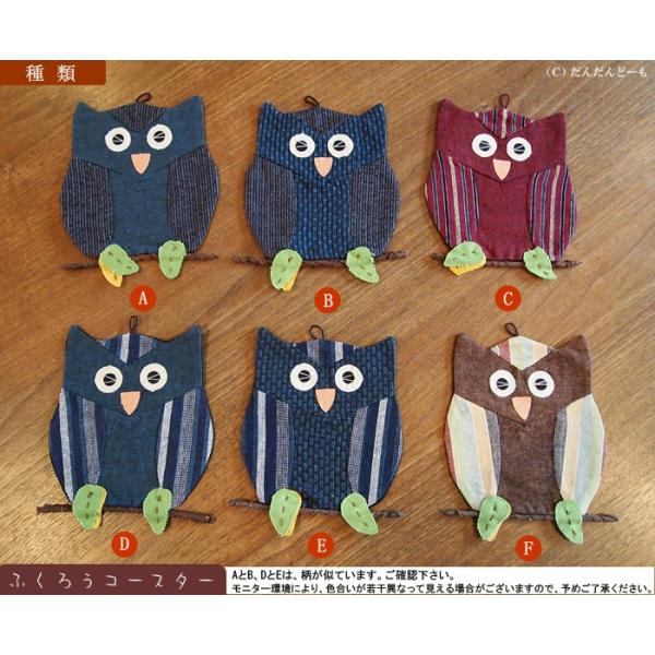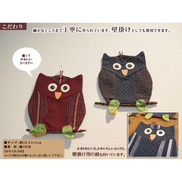 ふくろうの形をした可愛らしいコースターです。上部には紐がついており、壁掛けとしても使うことができます。