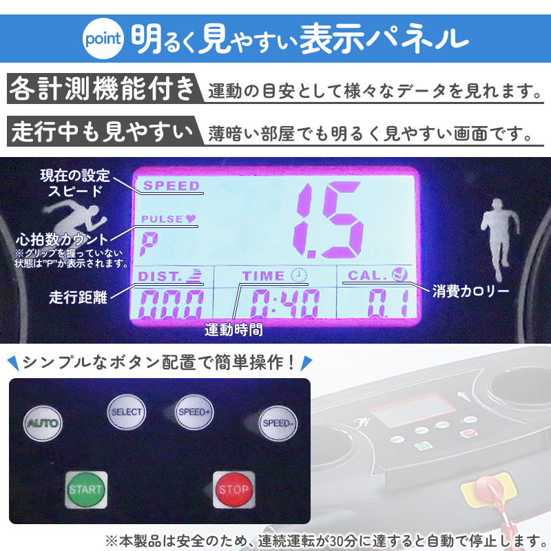 見やすいパネルでタイム、スピード、距離、目安消費カロリーをしっかり確認。