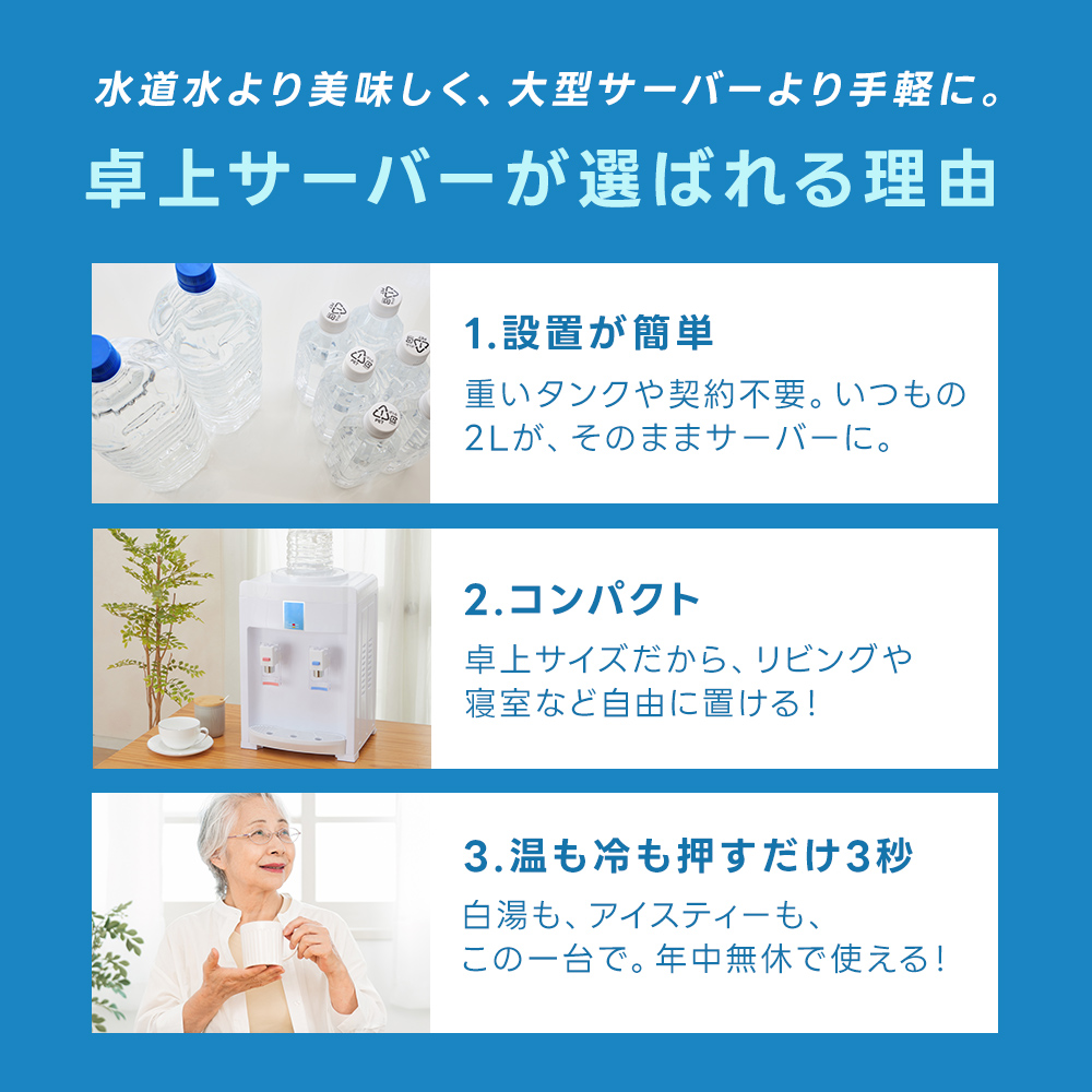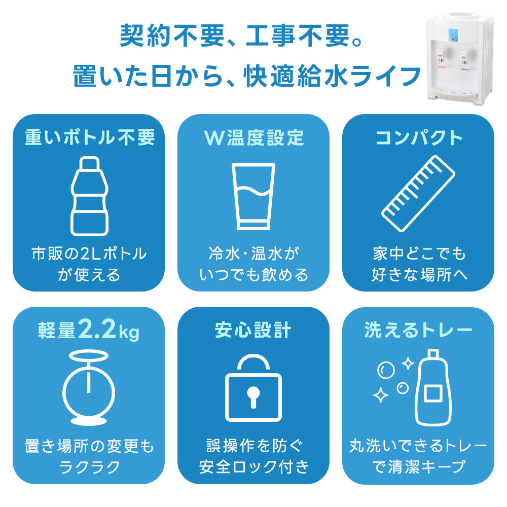 ウォーターサーバー 卓上ウォーターサーバー ペットボトル対応 2Lペットボトル コンパクト 軽量 室内専用 給水機 温水 冷水器 卓上サーバー 家庭用 小型 卓上水サーバー ミニサイズ デスク用ウォーターサーバー 水 お湯対応 給水器 オフィス用 一人暮らし キッチン用 卓上型 ウォーター ペットボトル式ウォーターサーバー 卓上型冷水機 温冷対応 卓上給水器 水分補給 小型ウォーターサーバー おしゃれ