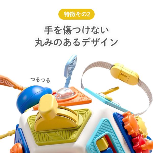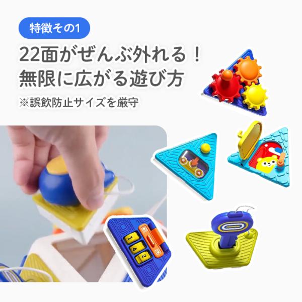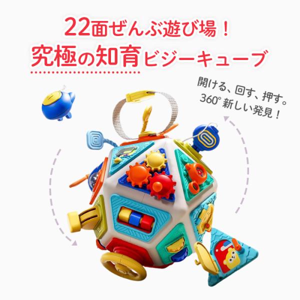 22面ビジーキューブは、22種類の仕掛けが詰まった、集中力と手先の器用さを育む多機能知育玩具です。