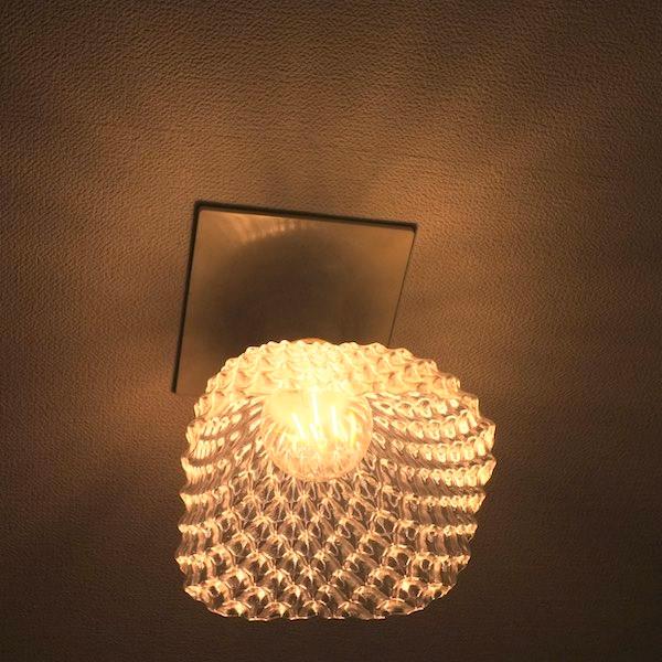 廊下やトイレなどの裸電球を透明な電球カバー「3Dデザインシェード」でかざってみませんか? この角形トロピカルフルーツ風模様つきの電球カバーは,普通の LED 電球にかんたんに取り付けられて,まぶしさがおさえられ,ひとあじ違う輝きがえられます.電球を LED フィラメント電球に変えれば,もっと きらきらと きらめきます.(下の写真をご覧ください.) 天井に魅力的な影ができます.また,ランプシェードが壊れたときに,そのかわりとして使うこともできます.ただし白熱電球には使用できません.