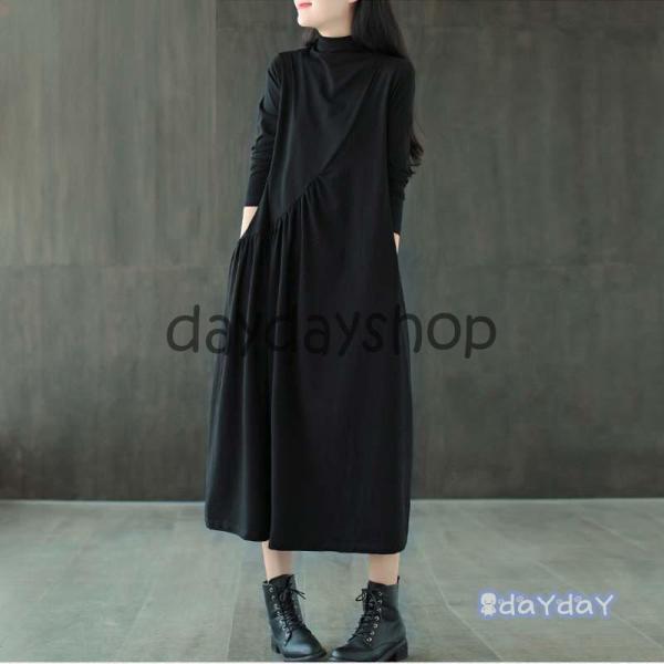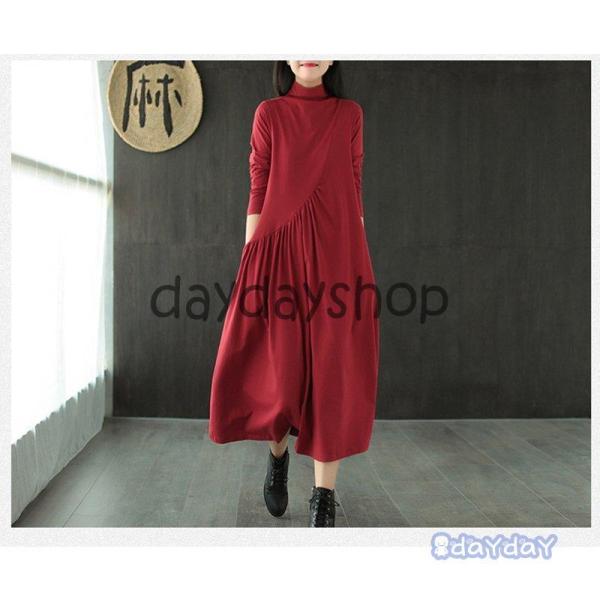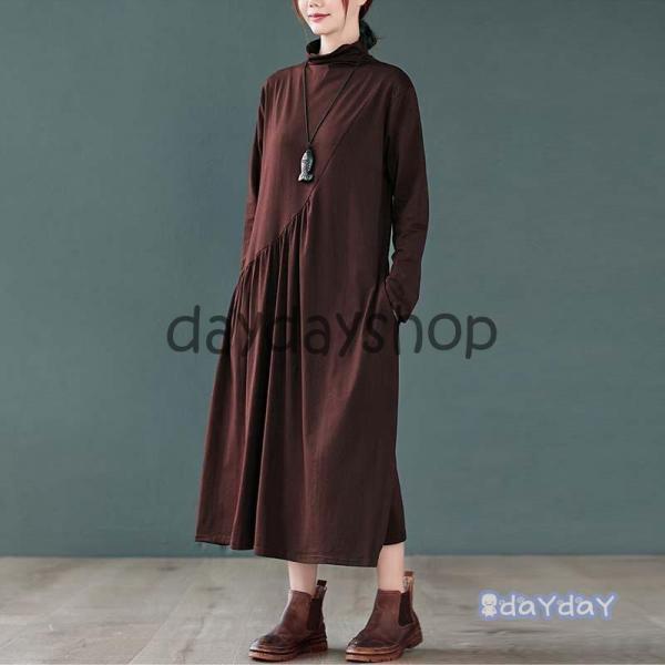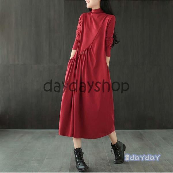 マキシワンピース チュニック ワンピース 40代 レディース 綿 体型カバー 長袖 無地 ハイネック aライン マキシ丈 大きいサイズ 20代 黒 赤 タック おしゃれ