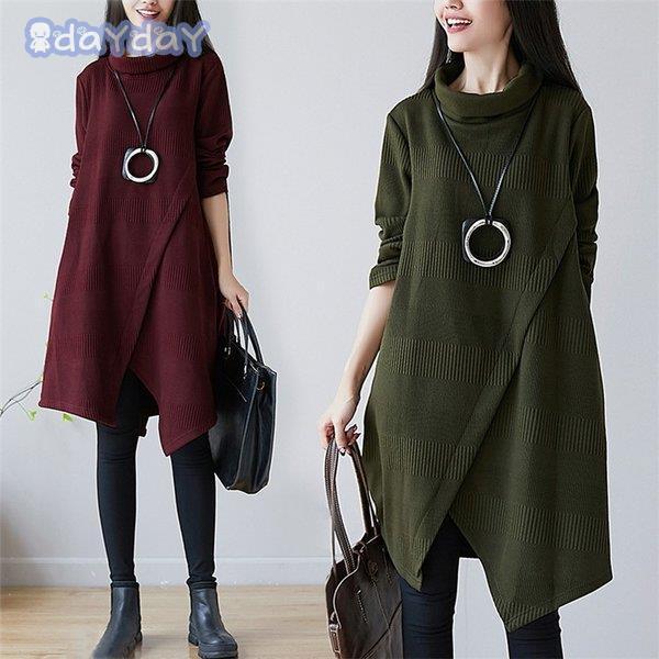 ワンピース レディース ひざ丈ワンピース チュニック デザイン 膝丈 無地 長袖 Aライン ハイネック 体型カバー 大きいサイズ きれいめ イレギュラー コーデ